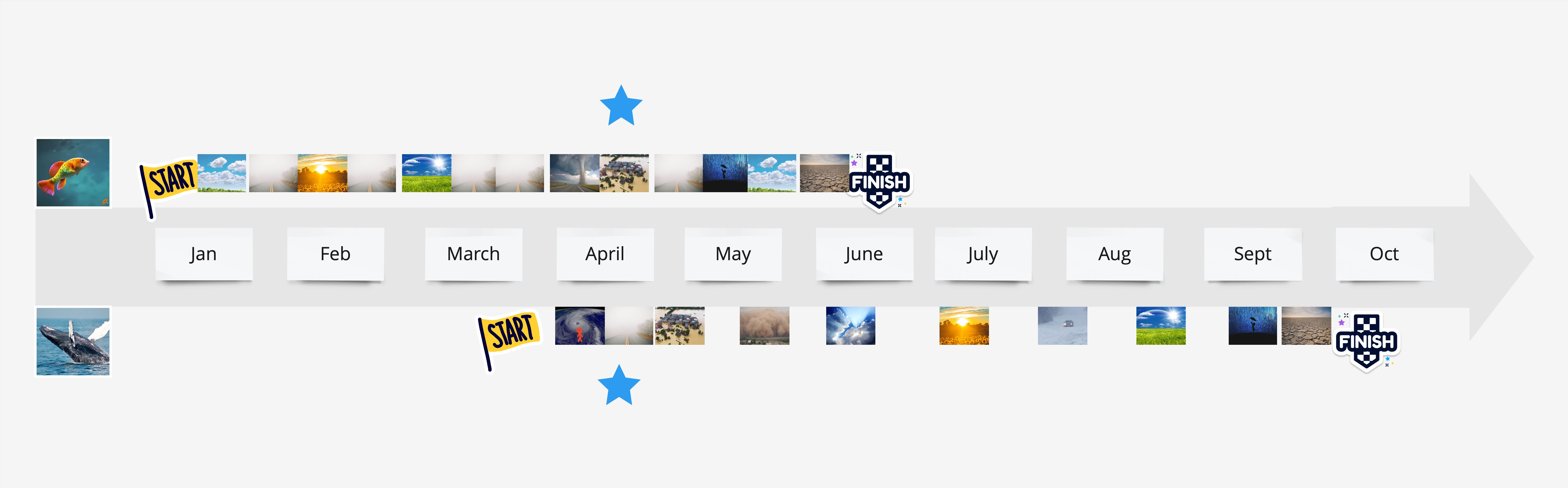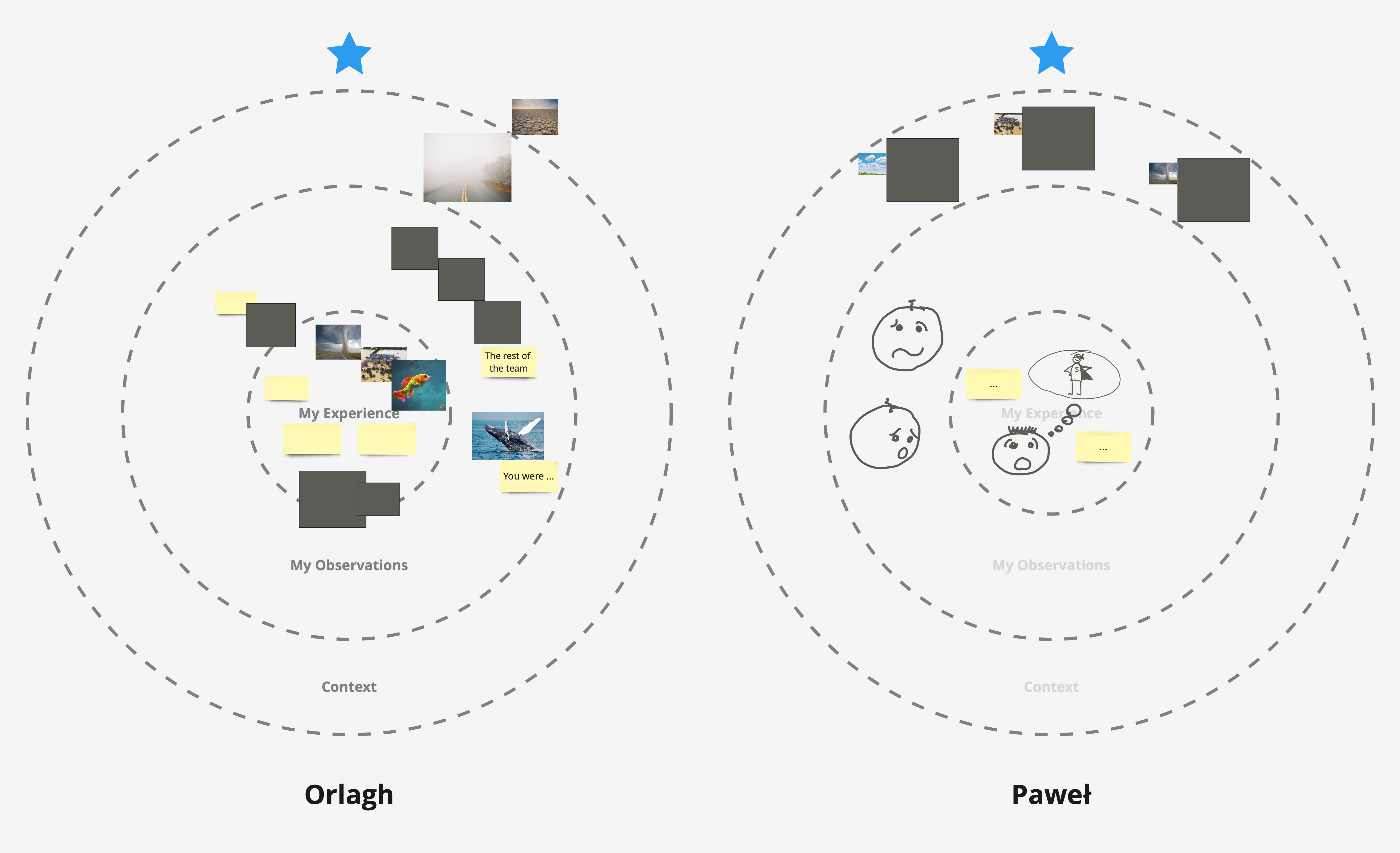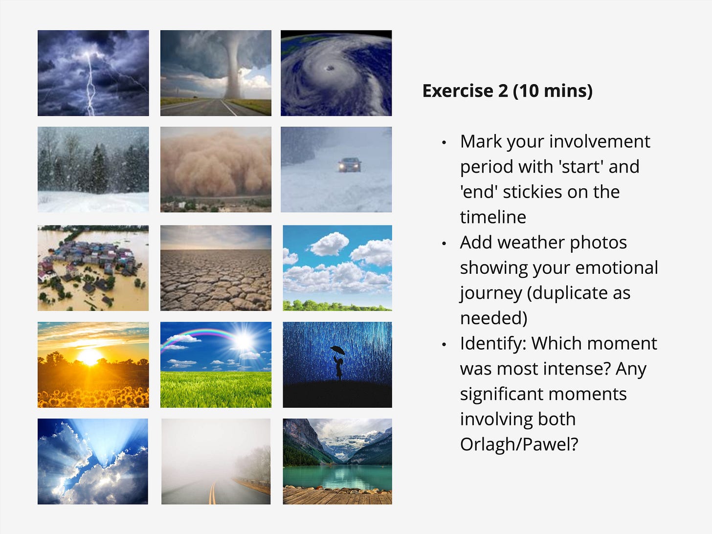 Next, we created a timeline with weather images showing our feelings throughout the project, both marking the disconnect moment with blue stars. Remarkably, we placed our stars at exactly the same moment—no explanation needed. The playful metaphors revealed layers we wouldn't normally discuss, helping me see her perspective while my explanation of context created visible understanding in her.