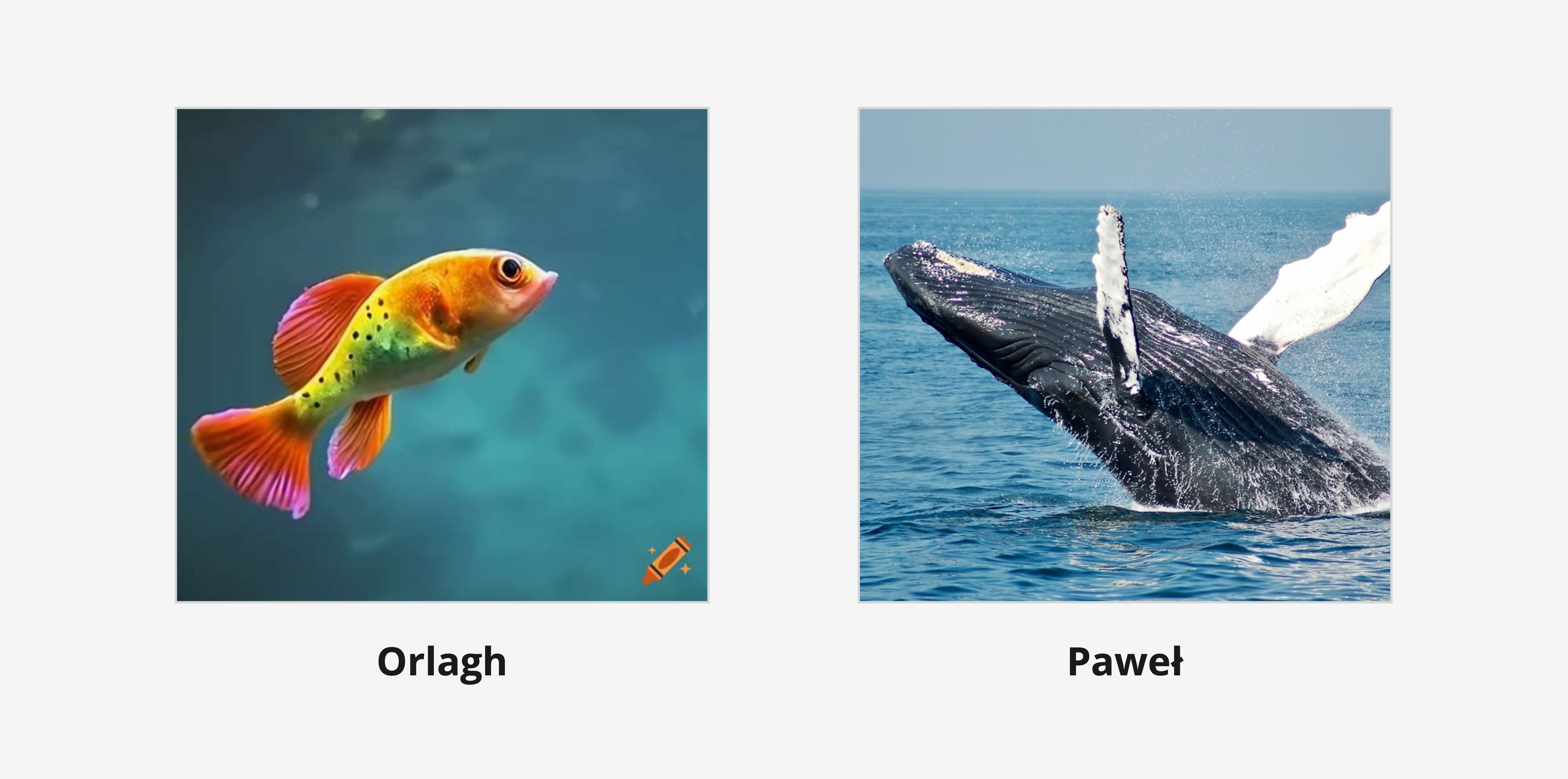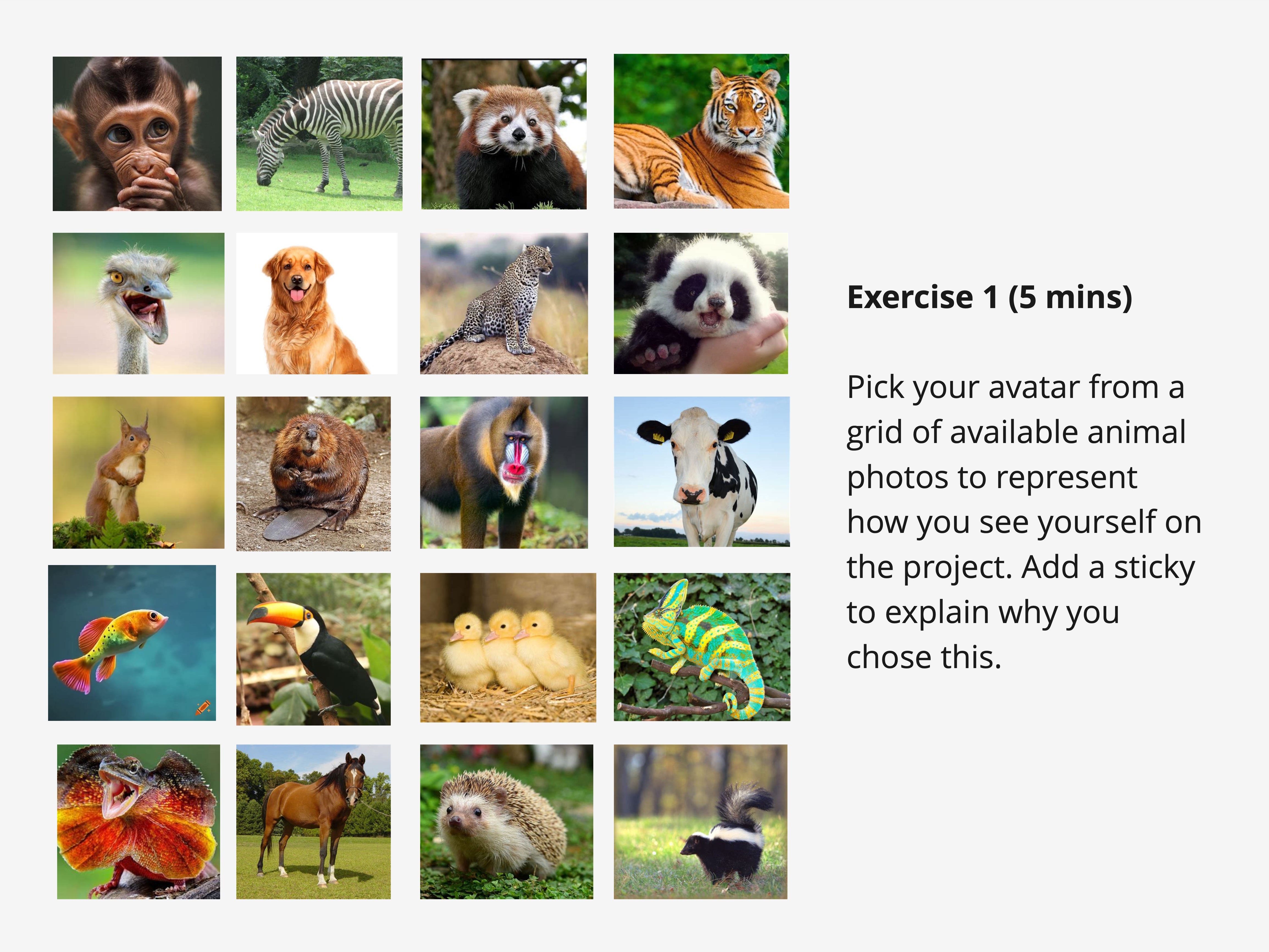We decided to start with Orlagh's designed exercises and finish with mine as the closing one. For our warm-up, we selected animal avatars representing our project roles—Orlagh chose a goldfish while I selected a whale.