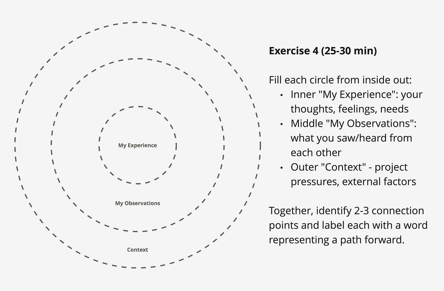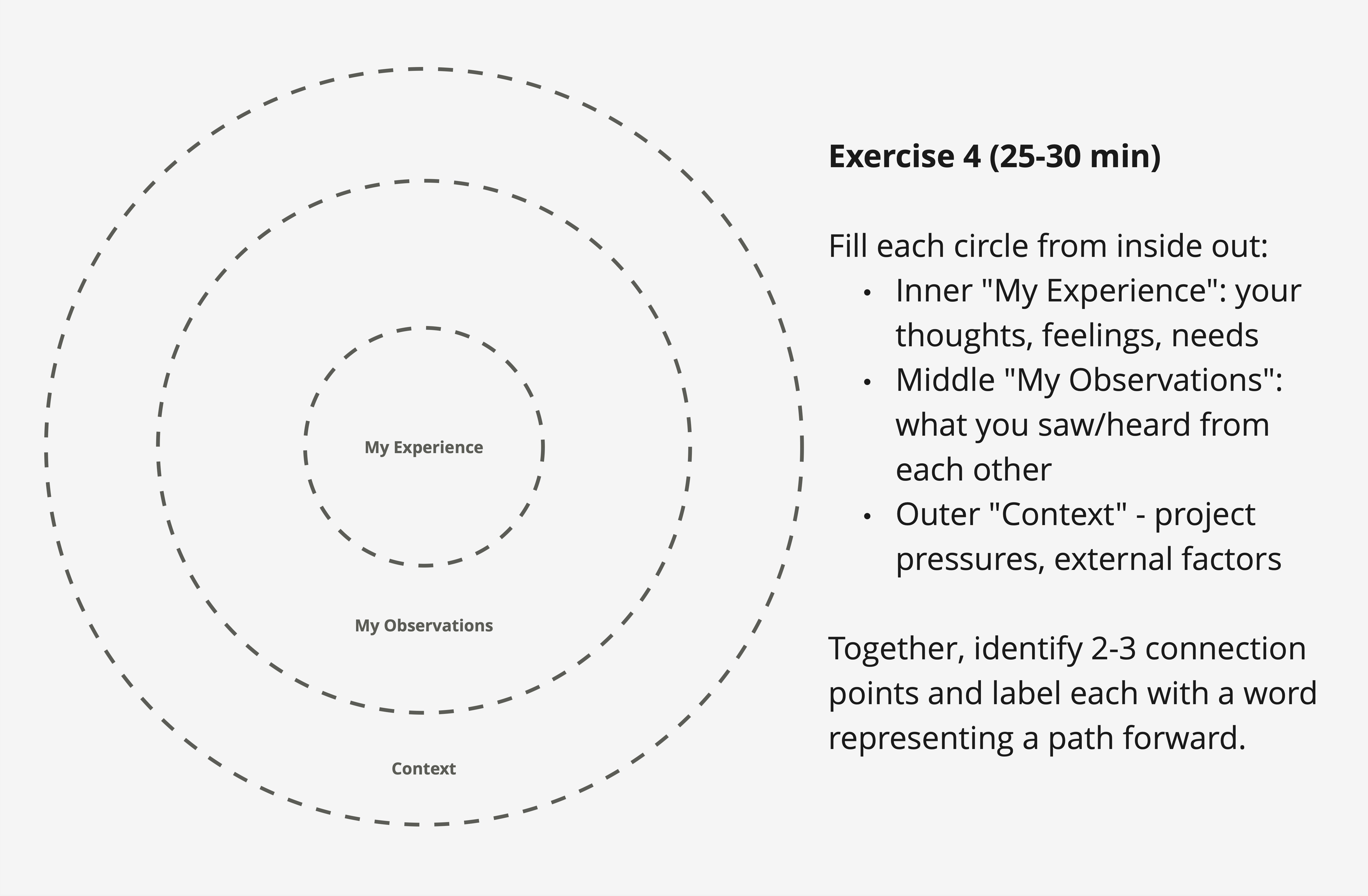 The exercises built a foundation of contextual understanding that enabled us to address our underlying tension. The concentric circles exercise finally allowed us to "take the bull by the horns." Separating feelings from observations created clarity that had been missing in our previous interactions.