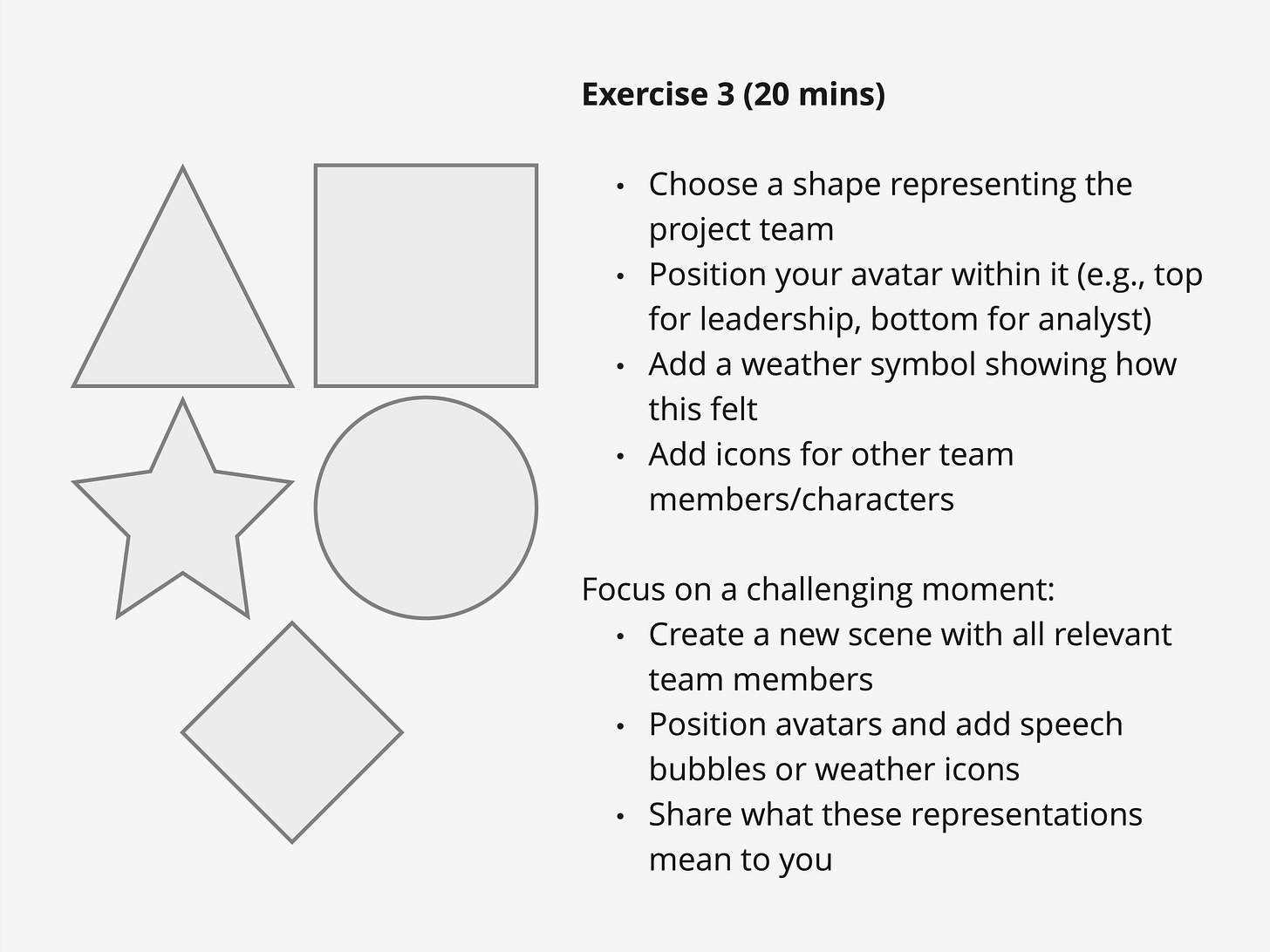 Our third exercise used basic shapes to represent team structure and relationships, allowing me to explain power dynamics and differing interests in our operating contexts. This discussion of team personalities took us off track. Having used our planned 90 minutes, we agreed to extend by 30 minutes for a final exercise addressing the specific moment of disconnection.